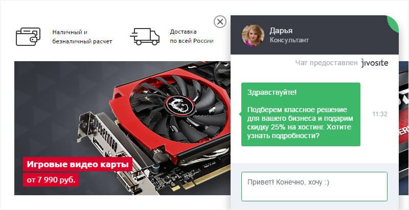 As you can see, setting up an online chat is simple: you just need to imagine yourself in the user's place and understand what message can be of interest and benefit to him. Customers for whom we set up the online consultant JivoSite say that online chat accounts for the lion's share of sales. And for one of the tire and wheel stores, the service became the main channel - it was so successfully integrated into business processes.
