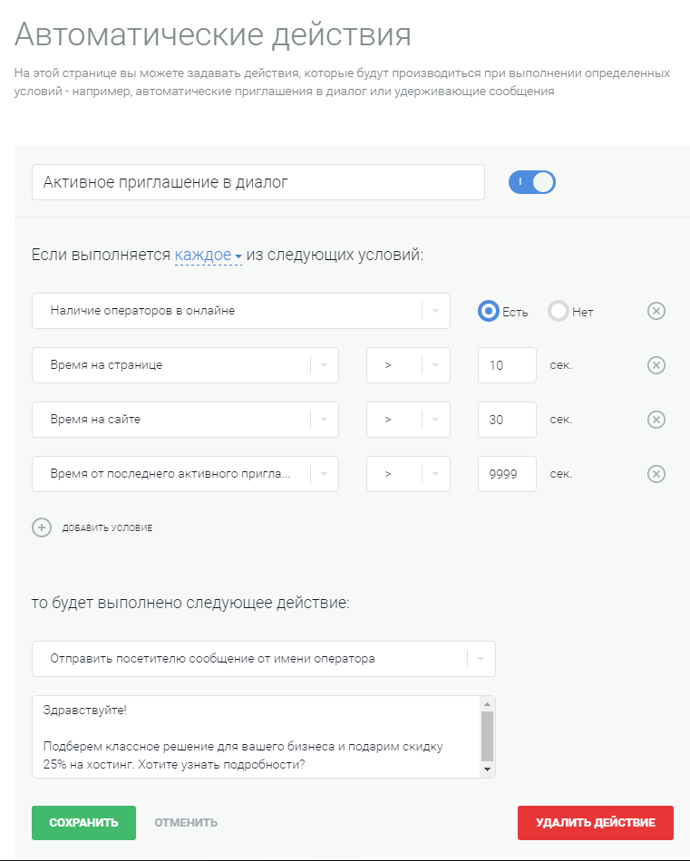 As with us: we have set 4 conditions, at the same time the fulfillment of which will activate the invitation to the chat.